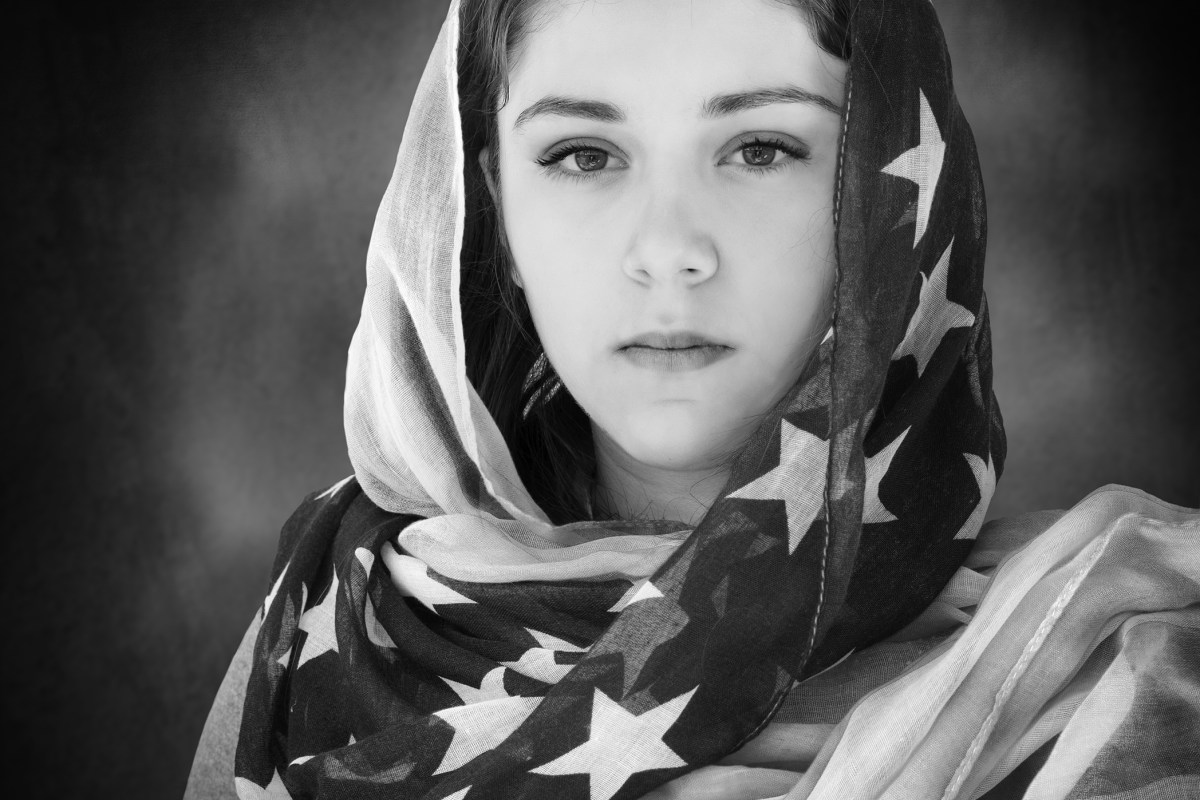 Ritratto, in un sapiente bianco e nero, di una giovane donna dal volto serio, lo sguardo deciso, sottilmente ostile, le labbra chiuse, su di uno sfondo che crea una sorta di aura luminosa intorno al capo; ma è nel velo, nel quale si riconosce con evidenza una bandiera americana e che le incornicia il volto, che cogliamo il significato aggiuntivo, il “punctum“ barthesiano, anche se voluto dalla fotografa, che ci attrae e ci “trafigge” modificando, con la sua presenza, la lettura classica del ritratto. E’ il velo che provoca in noi un turbamento intimo, un fermento emotivo, la tensione dell’inafferrabile che si vuole svelare. Il velo che copre il capo è un richiamo ad una tradizione millenaria, che passa attraverso diverse culture con diversi significati, ma in questa immagine ci manifesta una prospettiva completamente nuova, contrastando e confondendo le nostre certezze.