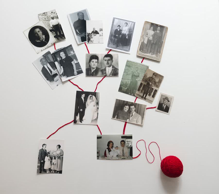Parto dalla foto con l’albero genealogico che è stata sapientemente costruita con vecchie e nuove foto della famiglia, unite nella loro genealogia, da un filo rosso che mette in evidenza i legami generazionali.