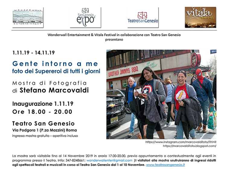 Venerdì 1 Novembre 2019 presso il Teatro San Genesio di Roma, nell’ambito degli eventi organizzati dalla Rassegna filantropica Vitala Festival in sostegno di arte e musica, nella sua ottava stagione, si inaugurerà la nuova mostra personale del fotografo Stefano Marcovaldi. Questa mostra significativamente intitolata Gente intorno a me, foto dei Supereroi di tutti i giorni, ben si cala nel contesto espositivo teatrale e musicale.