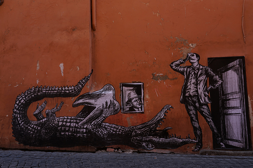 La prima foto, un alligatore a cui è stato cavato un improbabile molare, un dentista affranto, una losca figura che si affaccia da una finestra, andrebbe bene per l’illustrazione di un giallo di Carlotto.
