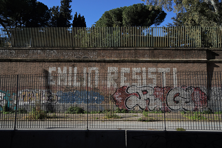 La foto con la scritta, ormai vecchia di alcuni anni, “Emilio resisti”, perché?: non so chi sia Emilio, ma la stessa scritta, in caratteri rigidamente geometrici, sembra suggerire una condizione di costrizione come anche la recinzione che la racchiude confermerebbe.
