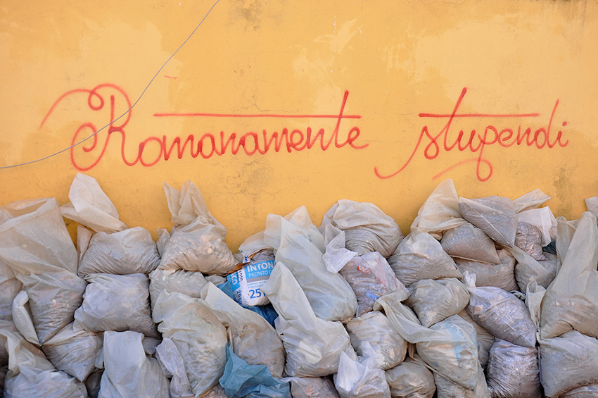 Alcune foto come quella con la scritta “Romanamente stupendi” mi ha colpito per la calligrafia: chi in un muro scalcinato di un quartiere popolare sopra dei sacchetti di calcinacci, può scrivere con tale abilità?