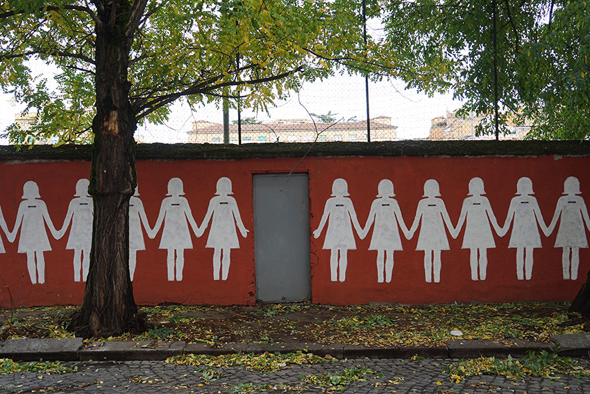 Il dramma dei femminicidi è illustrato dalla foto della sequenza delle figure femminili stilizzate ma ciascuna con un nome proprio. Ognuna è una storia di violenza che andrebbe narrata per non dimenticare.