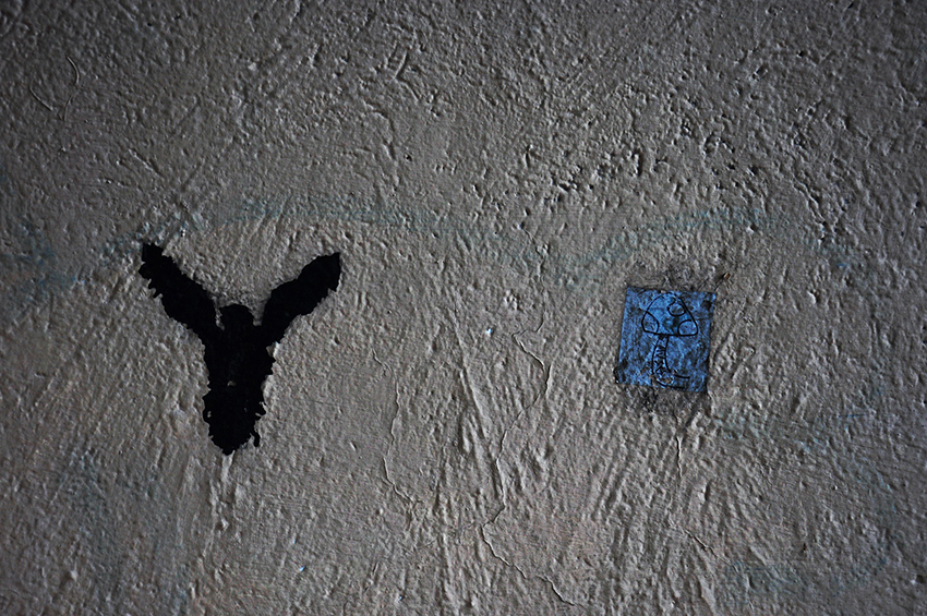 Completamente diversa la foto con una specie di piccolo angelo nero e un quadratino di muro azzurro: inferno e paradiso in piccole dosi?