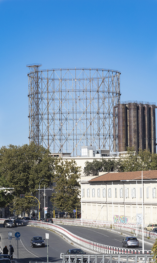 Questo è il motivo per cui tutte le foto sono scattate dall’esterno del complesso, da dove, comunque, la bellezza si coglie appieno, come pure l’evidente riferimento ad uno dei simboli storici dell’area di Ostiense: il Gazometro.